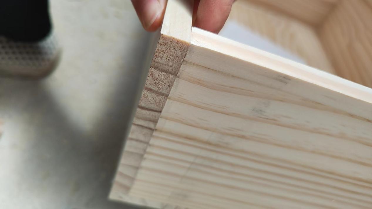 木材會(huì)隨著環(huán)境溫濕度變化自然伸縮,尤其是45度無榫拼接,缺少榫卯緩沖,變形后容易拉裂。正確做法:將板材在施工環(huán)境中靜置24小時(shí),讓木材適應(yīng)現(xiàn)場(chǎng)溫濕度,含水率控制在7%-12%之間。若用于戶外或者潮濕環(huán)境,還需提前做好板材防潮處理。